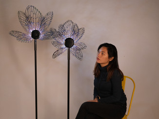 This lamp evokes memories of fragments of dragon wings collected after it has passed its lifetime. It is made by metal wire woven together and baked in different colors of enamel to vitrify and preserve the memory of the fragment.